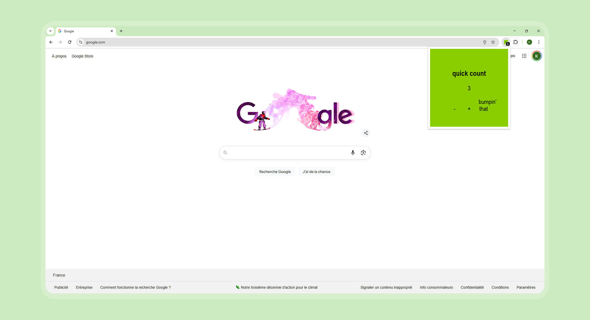 Ayant rencontré un besoin très spécifique un soir d’été, je me suis mise au travail. Cette extension navigateur permet de compter ses tours au crochets (ou autre activité par ailleurs) et s’inspire de l’album “brat” de Charli XCX dans sa tonalité et son esthétique. Ce projet s’inscrit dans une continuité de projets personnels, approfondissements de mon intérêt pour le développement et la programmation.
