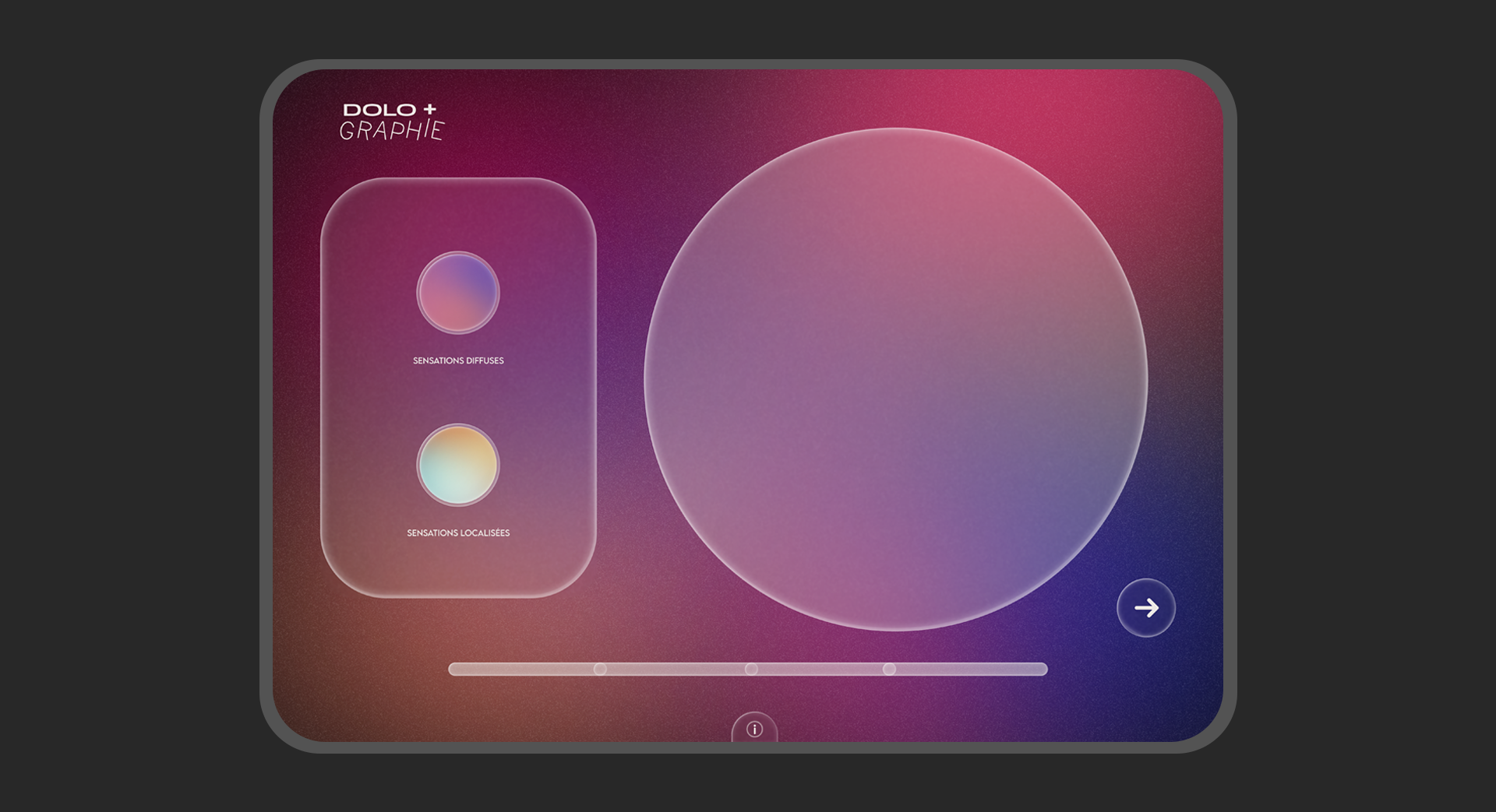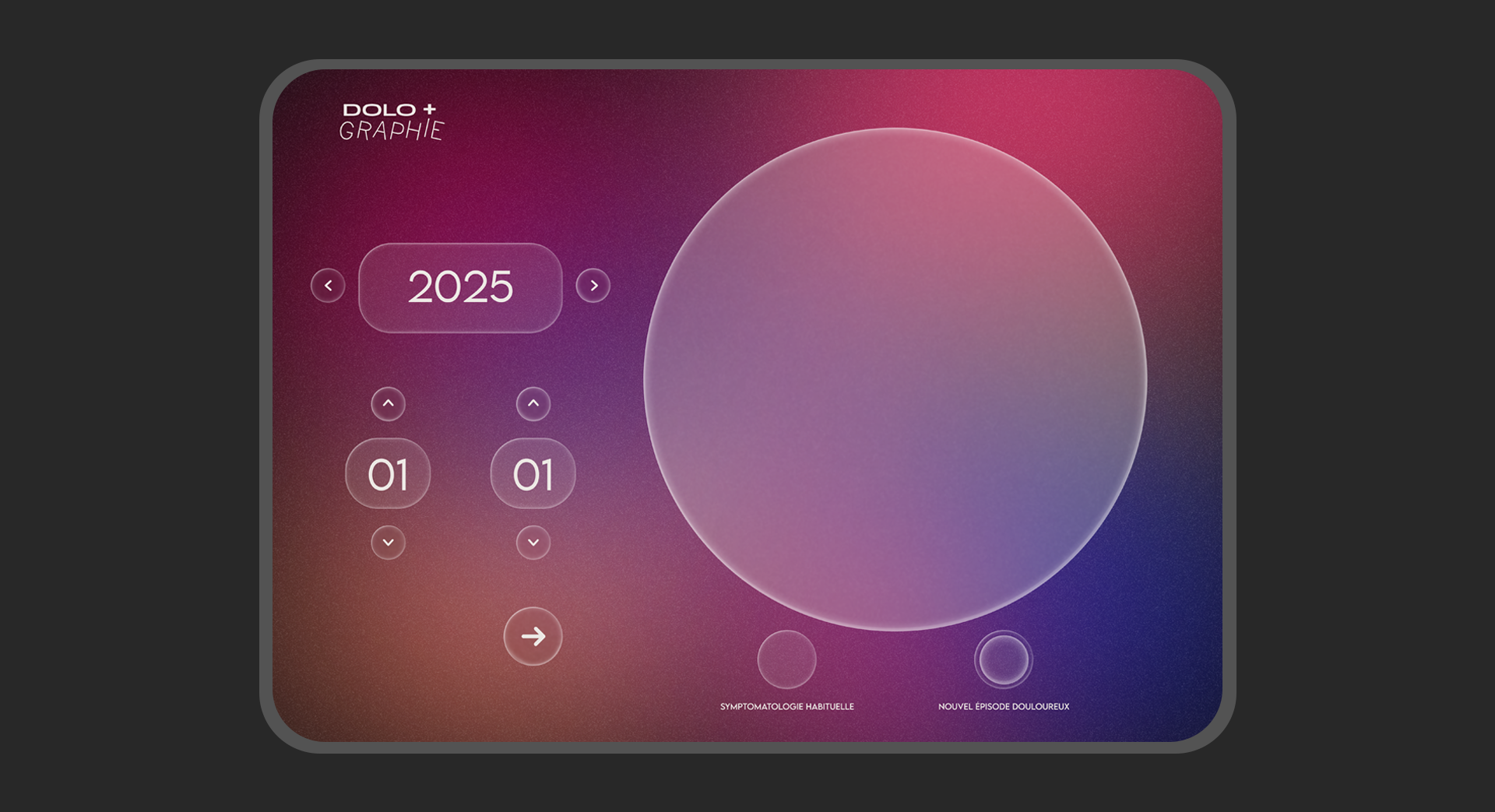 Cette interface est une proposition de langage graphique et d’expérience utilisateur tentant d’offrir des solutions facilitant l’échange entre patients et soignants et le suivi de leur douleur.
